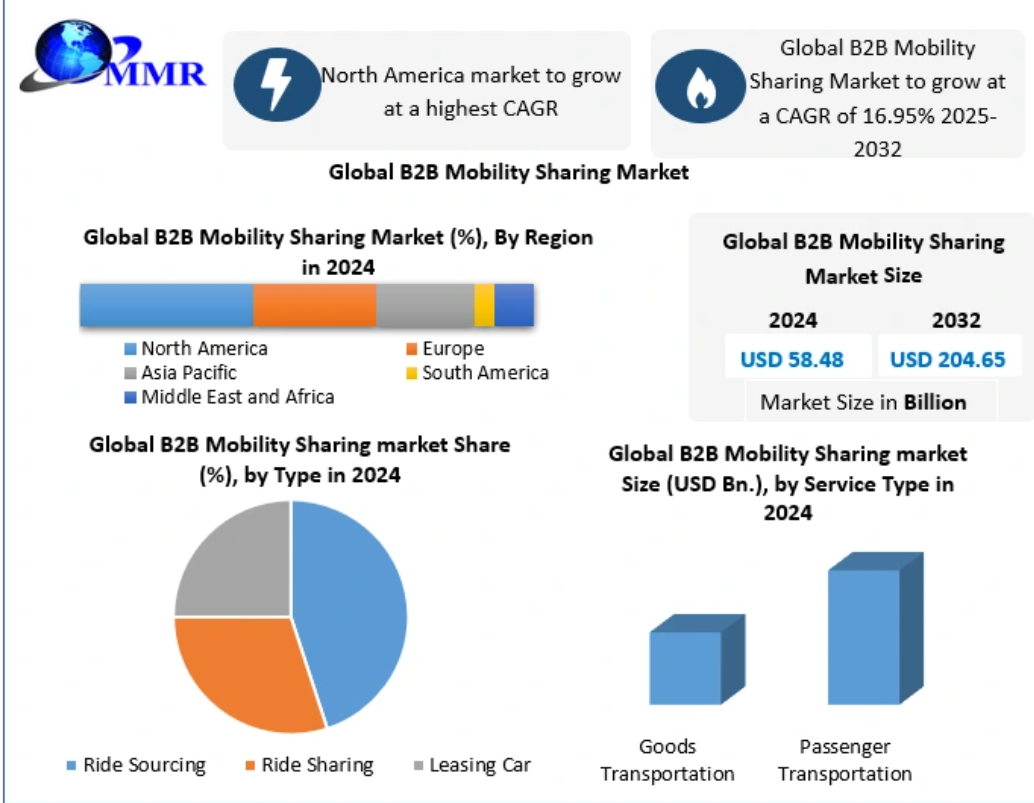 Global B2B Mobility Sharing Market size was valued at USD 58.48 Bn. in 2024, and the total Global B2B Mobility Sharing Market revenue is expected to grow by 16.95% from 2025 to 2032, reaching nearly USD 204.65 Bn.