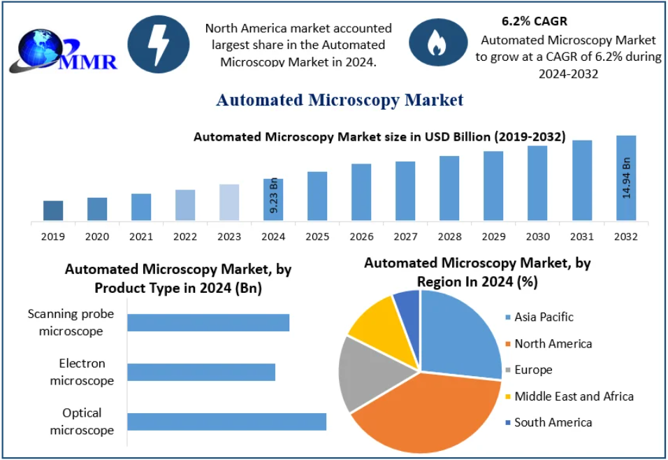 Automated Microscopy Market size was valued at USD 9.23 Billion in 2024 and the Automated Microscopy Market revenue is expected to reach USD 14.94 Billion by 2032, at a CAGR of 6.2 % over the forecast period.