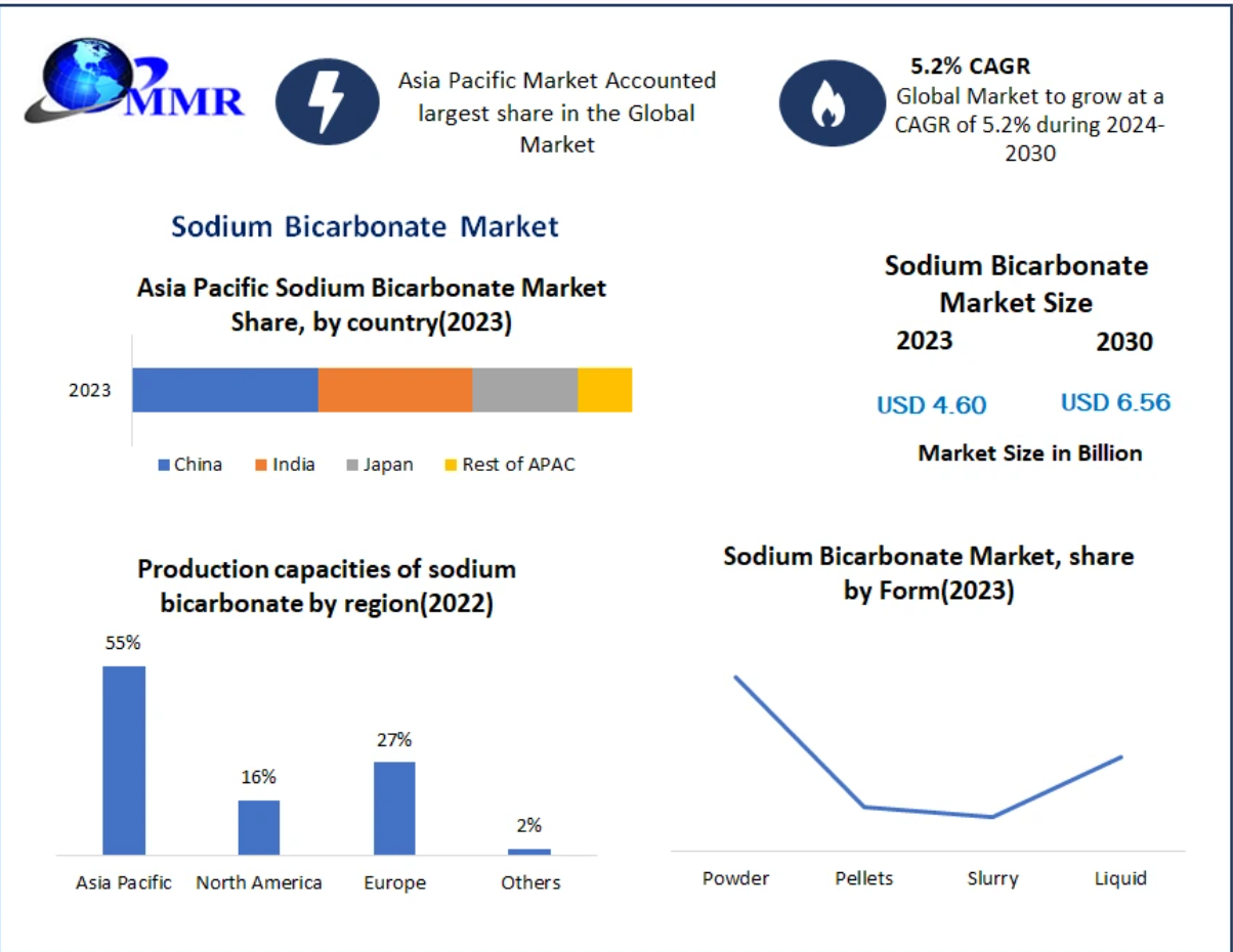 Sodium Bicarbonate Market was valued at USD 4.60 Bn in 2023 and is expected to reach USD 6.56 Bn by 2030, at a CAGR of 5.2 percent during the forecast period.