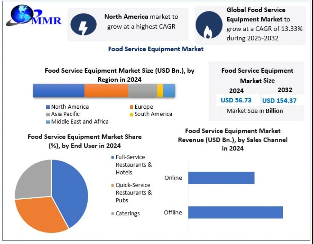 Food Service Equipment Market size was valued at USD 56.73 Bn. in 2024, and the Food Service Equipment Market revenue is expected to grow at a CAGR of 13.33% from 2025 to 2032, reaching nearly USD 154.37 Bn.