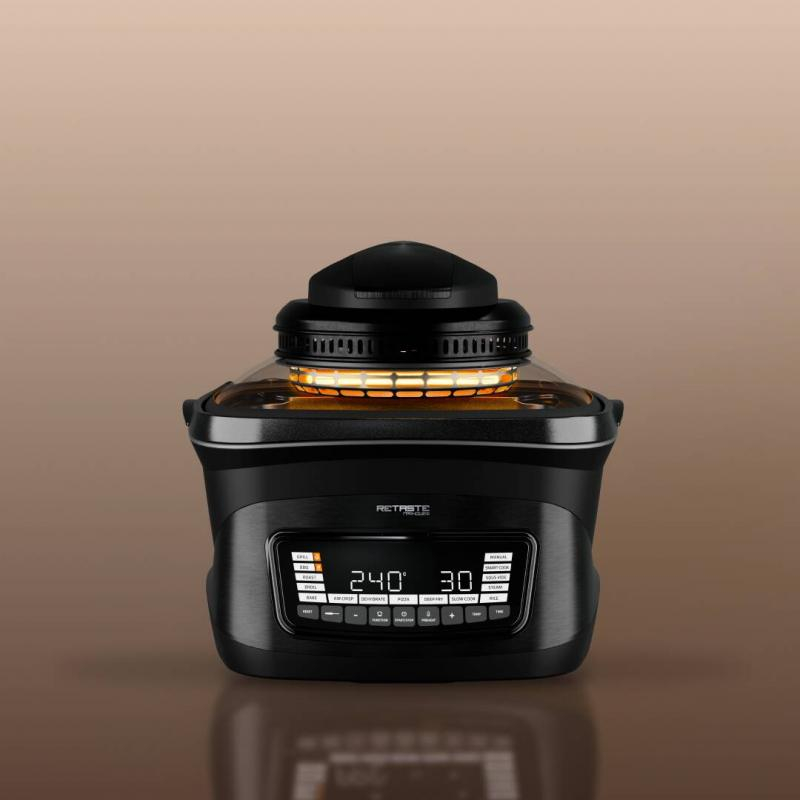 - Аэрогриль. Грандшеф Retaste создает аппетитную хрустящую корочку без пересушивания. Циркуляция воздуха, как в традиционной печи, делает картошку фри идеально хрустящей, а курицу – с блестящей золотистой кожицей, стейк идеальной прожарки. При этом потребление масла значительно снижается.