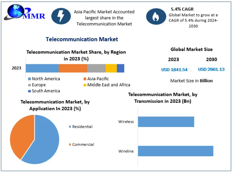The Global Telecommunication Market, valued at US$ 1841.54 billion in 2023, continues to undergo a rapid transformation driven by next-generation technologies, shifting consumer preferences, and massive investments in digital infrastructure. With a projected CAGR of 5.4% from 2024 to 2030, the market is expected to reach US$ 2661.13 billion by the end of the forecast period, reflecting the profound acceleration of global connectivity, cloud adoption, and data consumption.