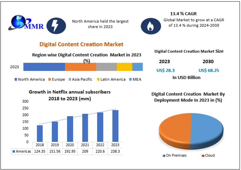 The Global Digital Content Creation Market, valued at USD 28.3 billion in 2023, is projected to reach USD 68.25 billion by 2030, expanding at a CAGR of 13.4%. Rapid digitalization, the growth of streaming platforms, and the rising prominence of user-generated content (UGC) continue to reshape how content is produced, distributed, and consumed across industries.