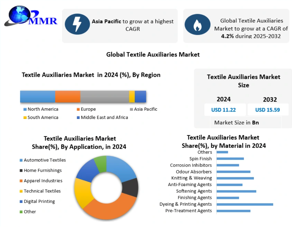 Textile Auxiliaries Market was valued at USD 11.22 Bn. in 2024, and the Global Textile Auxiliaries Market is expected to reach USD 15.59 Bn by 2032, at a CAGR of 4.2% during the forecast period.