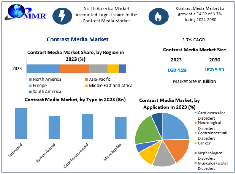 The Contrast Media Market was valued at US$ 4.29 Billion in 2023 and is projected to grow at a CAGR of 3.7% from 2024 to 2030, reaching approximately US$ 5.53 Billion by 2030. Contrast media are specialized chemical agents administered to patients prior to diagnostic imaging procedures to enhance the visibility of internal organs, tissues, and blood vessels. These agents play a vital role in improving diagnostic accuracy across imaging modalities such as X-ray, computed tomography (CT), magnetic resonance imaging (MRI), and ultrasound.