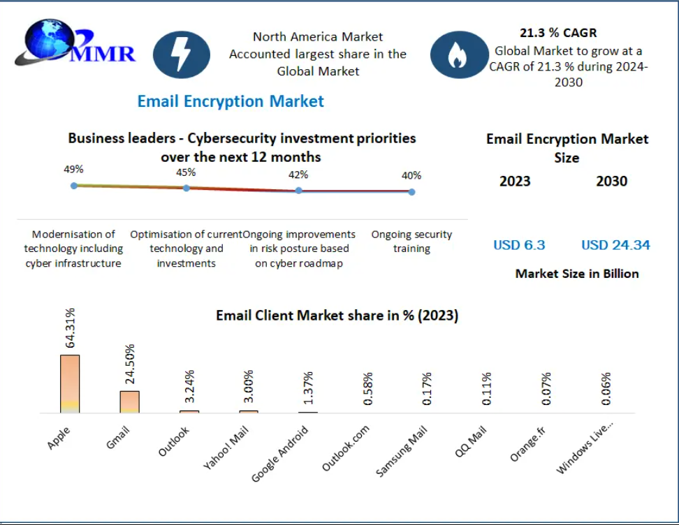 The Global Email Encryption Market was valued at USD 6.3 billion in 2023 and is projected to reach USD 24.34 billion by 2030, growing at a robust CAGR of 21.3% during the forecast period (2024–2030). The rapid expansion of this market is driven by escalating cyber threats, increasing regulatory pressure, and the widespread adoption of digital communication across industries.