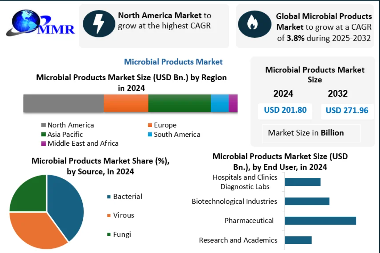 Global Microbial Product Market size was valued at USD 201.80 Bn in 2024, and the total Microbial Product Market revenue is expected to grow by 3.8% from 2025 to 2032, reaching nearly USD 271.96 Bn.