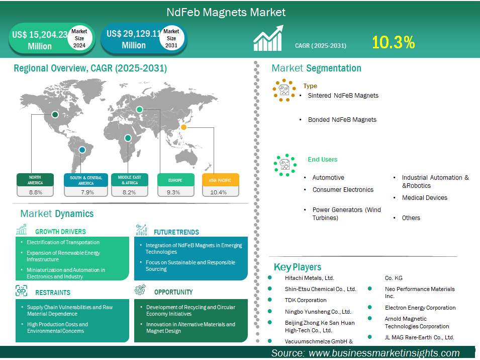 According to market analysis, the neodymium iron boron (NdFeB) permanent magnet market size is expected to reach US$ 29,129.11 million by 2031 from US$ 15,204.23 million in 2024. The market is estimated to record a CAGR of 10.3% from 2025 to 2031, driven by rising adoption of electric mobility, increasing renewable energy investments, and growing demand for high-performance electronic devices.