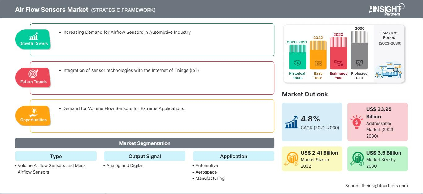 The airflow sensors market size is projected to reach US$ 3.50 billion by 2030 from US$ 2.41 billion in 2022. The market is expected to register a CAGR of 4.8% during 2022–2030. Integration of sensor technologies with the Internet of Things (IoT) is likely to remain a key trend in the market.