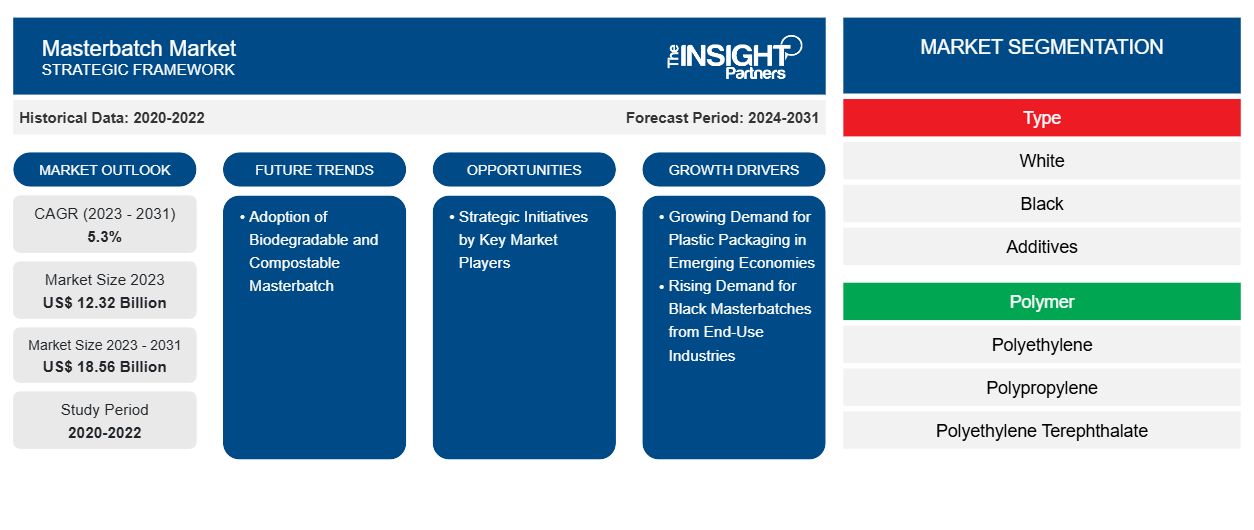 The masterbatch market was valued at US$ 12.32 billion in 2023 and is expected to reach US$ 18.56 billion by 2031; it is estimated to register a CAGR of 5.3% from 2023 to 2031.