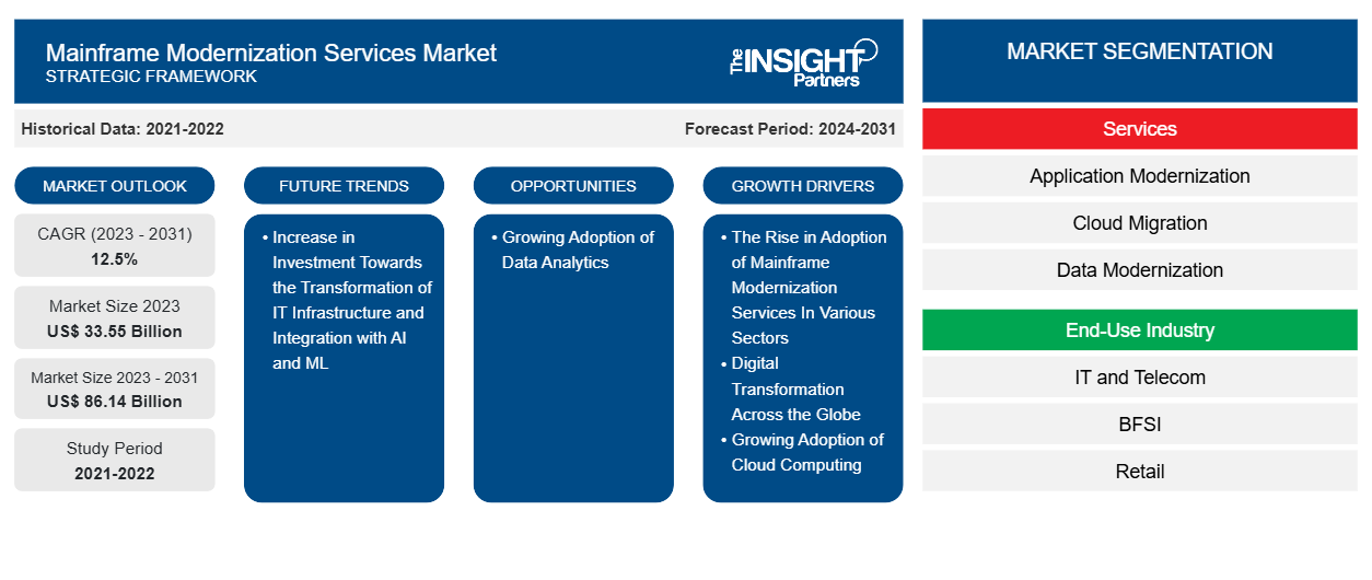 The mainframe modernization services market size is expected to reach US$ 86.14 billion by 2031 from US$ 33.55 billion in 2023. The market is estimated to record a CAGR of 12.5% from 2023 to 2031. An increase in investment toward the transformation of IT infrastructure and integration with AI and machine learning is likely to remain a key market trend.