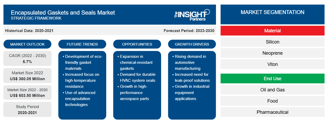 The encapsulated gaskets and seals market size was valued at US$ 360.05 million in 2022 and is expected to reach US$ 603.50 million by 2030; it is estimated to register a CAGR of 6.7% from 2022 to 2030.