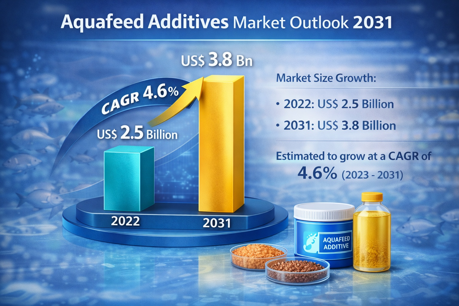 The global aquafeed additives market is gaining steady momentum as aquaculture emerges as a critical solution to meet rising global food demand. Valued at US$ 2.5 Bn in 2022, the market is projected to reach US$ 3.8 Bn by the end of 2031, expanding at a CAGR of 4.6% from 2023 to 2031. Growth in this market is largely driven by increasing demand for protein-rich food, declining arable land availability, and the rising importance of aquaculture as a sustainable food production system.