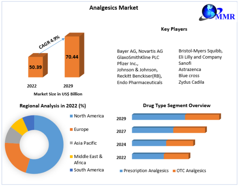 The global Analgesics Market represents a critical segment of the pharmaceutical industry, addressing one of the most fundamental healthcare needs: pain management. In 2022, the market was valued at US$ 50.39 billion and is projected to expand at a CAGR of 4.9% from 2023 to 2029 , reaching nearly US$ 70.44 billion by 2029 .