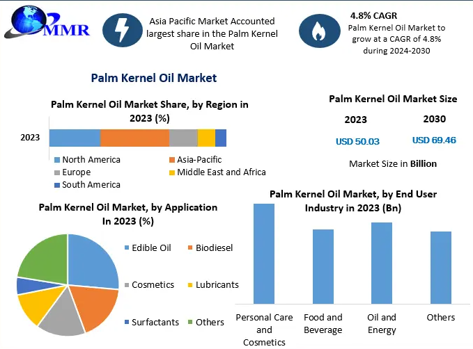 Valued at US$ 50.03 billion in 2023, the Palm Kernel Oil Market is projected to grow at a compound annual growth rate (CAGR) of 4.8% during the forecast period from 2024 to 2030, reaching an estimated US$ 69.46 billion by 2030. This growth reflects increasing consumption across emerging economies, expanding applications in processed foods and cosmetics, and rising utilization in biodiesel production.