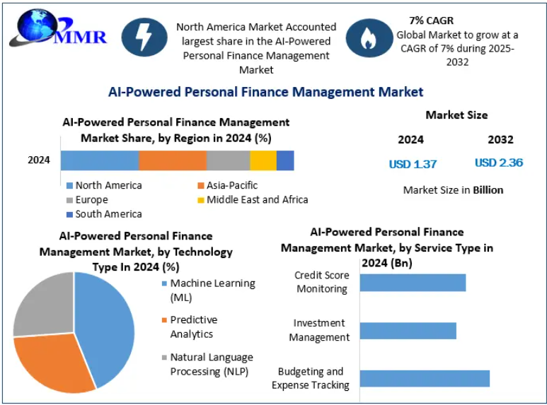 The AI-Powered Personal Finance Management (PFM) Market is gaining strong momentum as consumers increasingly rely on intelligent digital tools to manage their finances efficiently. Valued at USD 1.37 billion in 2024, the market is projected to expand at a CAGR of 7% from 2025 to 2032, reaching approximately USD 2.36 billion by 2032. This growth reflects rising demand for automation, personalization, and data-driven financial decision-making.