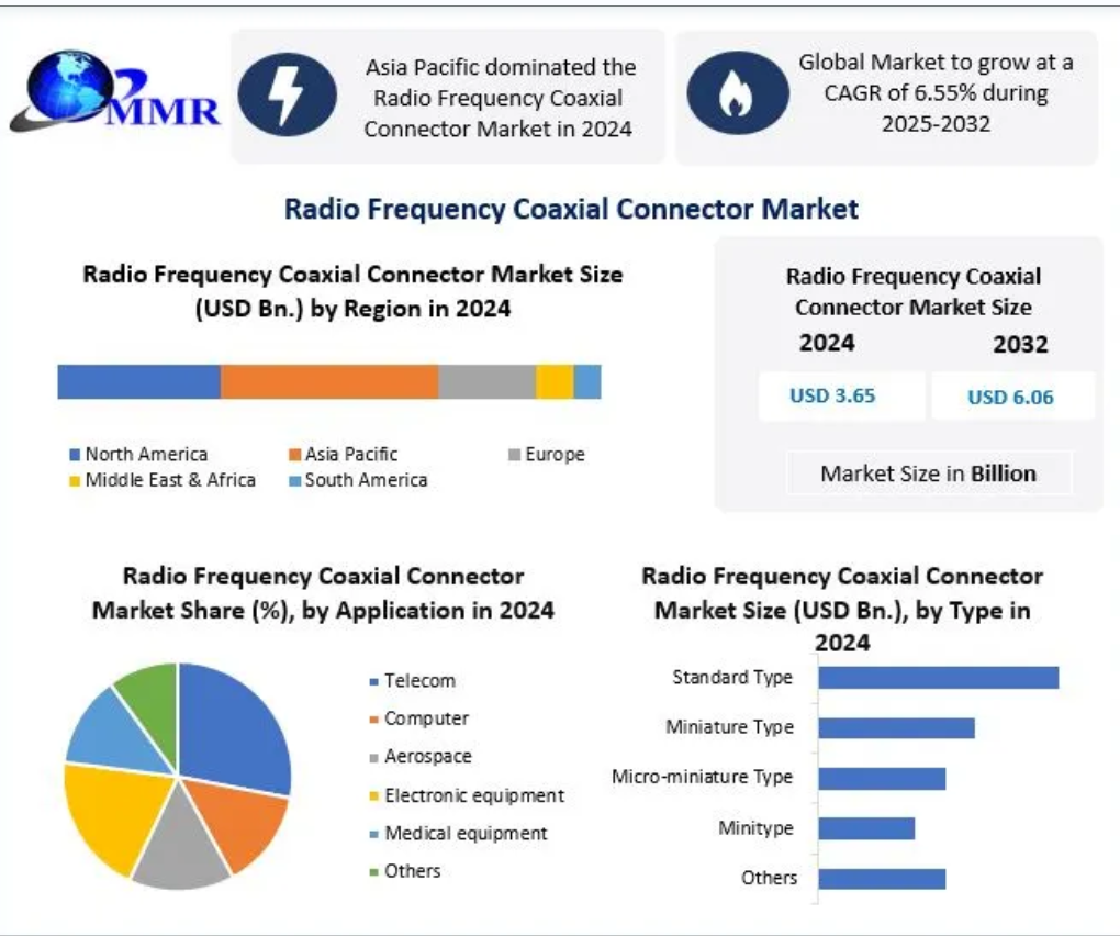 Radio Frequency Coaxial Connector Market valued at USD 3.65 Bn. in 2024, projected to reach USD 6.06 Bn. at a CAGR of 6.55% and driven by 5G rollout and smart tech boom.