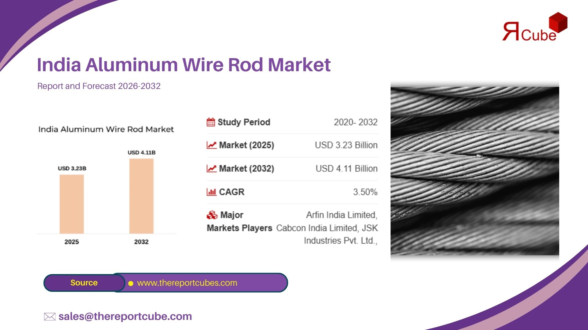 According to The Report Cube, India Aluminum Wire Rod Market Research Report (2026–2032), the market reached an estimated value of USD 3.23 Billion in 2025. Based on current industry structure and observed demand patterns, the market is forecast to reach USD 4.11 Billion by 2032, expanding at a compound annual growth rate (CAGR) of 3.50%. Over the forecast period 2026-2032