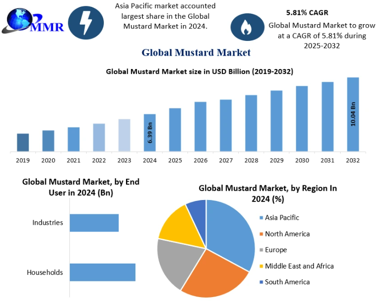 According to industry analysis, the Mustard Market was valued at USD 6.39 Billion in 2024 and is projected to grow at a compound annual growth rate (CAGR) of 5.81% from 2025 to 2032, reaching nearly USD 10.4 Billion by 2032. This growth trajectory reflects rising consumer demand, expanding applications, and increasing adoption of mustard-based products across multiple sectors.