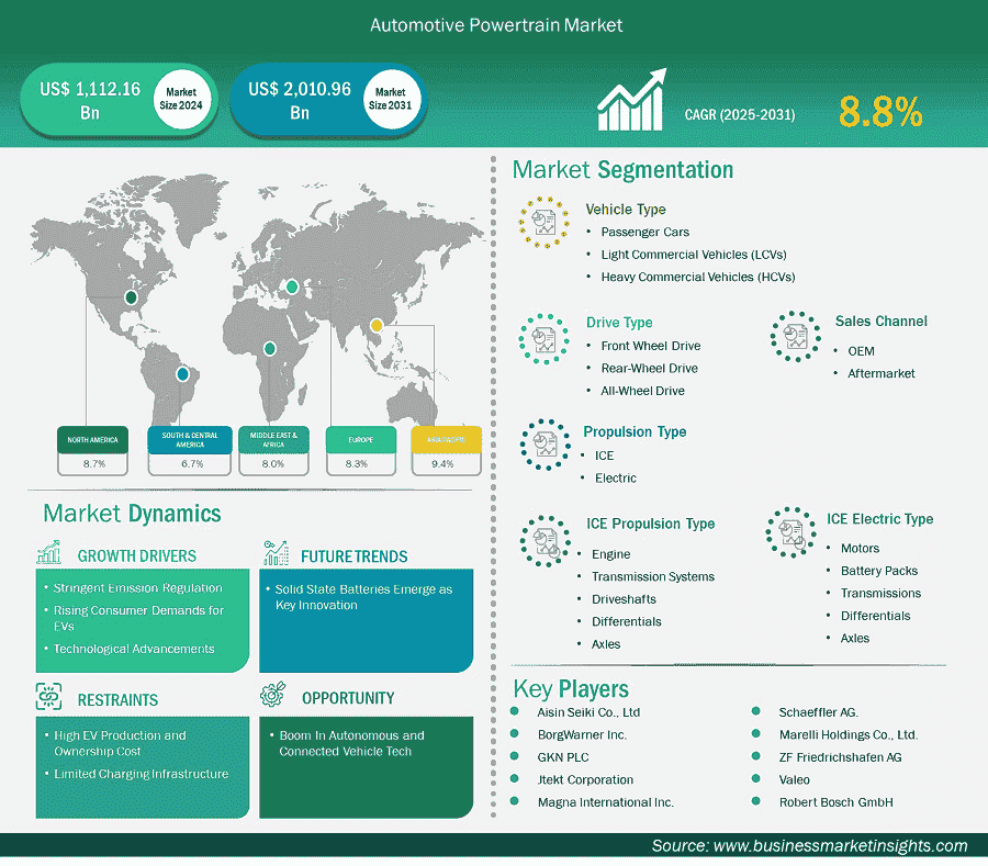 According to recent market insights, the automotive powertrain market size is expected to reach US$ 2,010.96 billion by 2031 from US$ 1,112.16 billion in 2024. The market is estimated to register a CAGR of 8.8% from 2025 to 2031, highlighting strong growth prospects supported by electrification trends, stringent emission regulations, and technological innovation across both internal combustion engine (ICE) and electric powertrain platforms.