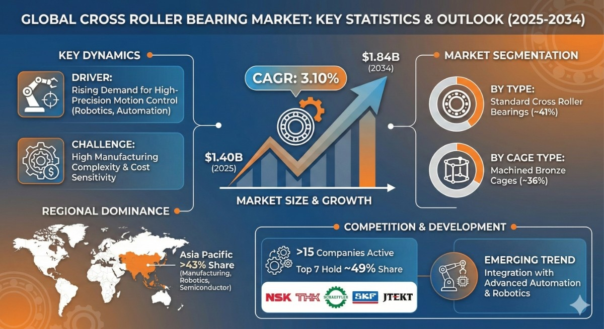 According to the latest report by The Report Cube, study Cross Roller Bearing Market is anticipated to register a 3.10% during 2026-2034. The market size was valued at USD 1.40 billion in 2025 and is projected to reach USD 1.84 billion by 2034. The market is witnessing steady growth driven by rising demand for high-precision motion control components across industrial automation, robotics, and advanced manufacturing sectors. Cross roller bearings are increasingly preferred in applications requiring high rigidity, compact design, and the ability to handle radial, axial, and moment loads simultaneously.