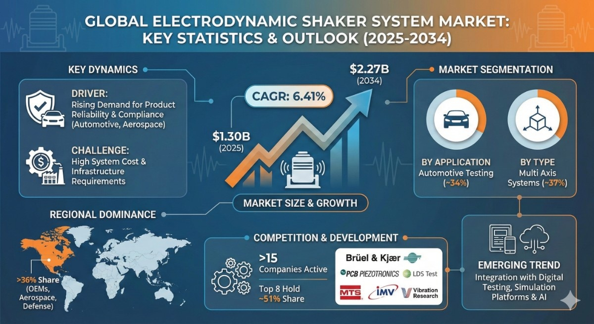According to the latest report by The Report Cube, study Electrodynamic Shaker System Market is anticipated to register a 6.41% during 2026-2034. The market size was valued at USD 1.30 billion in 2025 and is projected to reach USD 2.27 billion by 2034. The market is witnessing strong growth driven by increasing demand for vibration and shock testing across automotive, aerospace, electronics, and defense industries. Electrodynamic shaker systems are widely used to simulate real-world vibration environments, ensuring product durability, reliability, and compliance with international quality standards.