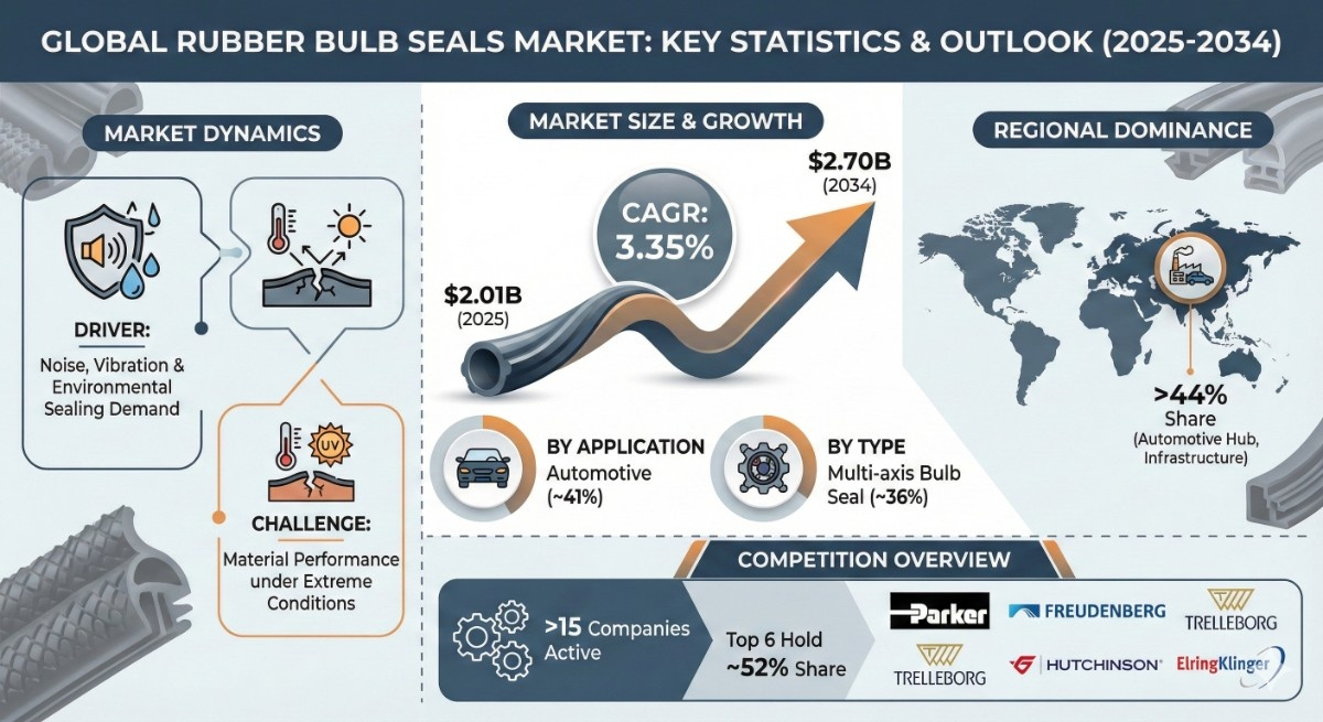 According to the latest report by The Report Cube, study Rubber Bulb Seals Market is anticipated to register a 3.35% during 2026-2034. The market size was valued at USD 2.01 billion in 2025 and is projected to reach USD 2.70 billion by 2034. The market is experiencing steady growth driven by increasing demand for effective sealing, vibration damping, and noise reduction solutions across automotive, aerospace, electronics, and industrial infrastructure applications. Rubber bulb seals are widely used to provide airtight, watertight, and dust-resistant sealing in doors, panels, enclosures, and hatches.
