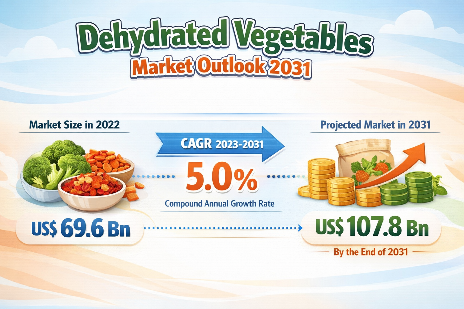 The global Dehydrated Vegetables Market is witnessing substantial growth as changing consumer lifestyles, increasing urbanization, and expansion of the food service sector continues to transform global food consumption patterns. Dehydrated vegetables are gaining widespread acceptance across the food industry due to their extended shelf life, preserved nutritional content, ease of storage, and convenience in food preparation. The market, valued at US$ 69.6 billion in 2022, is projected to reach US$ 107.8 billion by 2031, growing at a compound annual growth rate (CAGR) of 5.0% during the forecast period from 2023 to 2031. Rising demand for ready-to-eat meals, expanding restaurant chains, and growing preference for shelf-stable food ingredients are significantly driving market expansion.