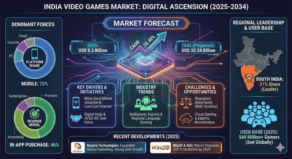 According to the latest report by The Report Cube, study India Video Games Market is anticipated to register a CAGR of 16.40% during 2026-2034. The market size was valued at USD 8.5 billion in 2025 and is projected to reach USD 33.34 billion by 2034. India has emerged as one of the fastest-growing gaming economies globally, supported by a young population, rapid digital adoption, and rising disposable incomes. Video gaming in India has evolved from a niche entertainment activity into a mainstream digital ecosystem spanning mobile, PC, console, and cloud platforms.