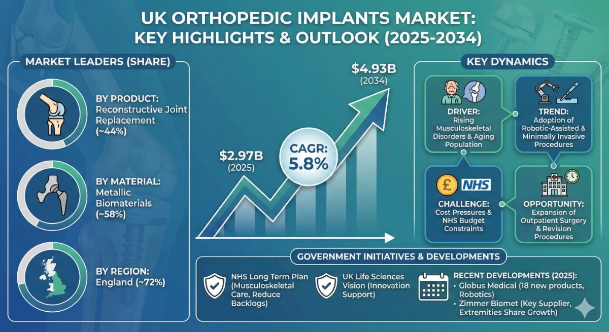 According to the latest report by The Report Cube, study UK Orthopedic Implants Market is anticipated to register a CAGR of 5.8% during 2026–2034. The market size was valued at USD 2.97 billion in 2025 and is projected to reach USD 4.93 billion by 2034. Orthopedic implants play a central role in restoring mobility, reducing pain, and improving quality of life for patients affected by degenerative joint diseases, trauma, and spinal disorders.