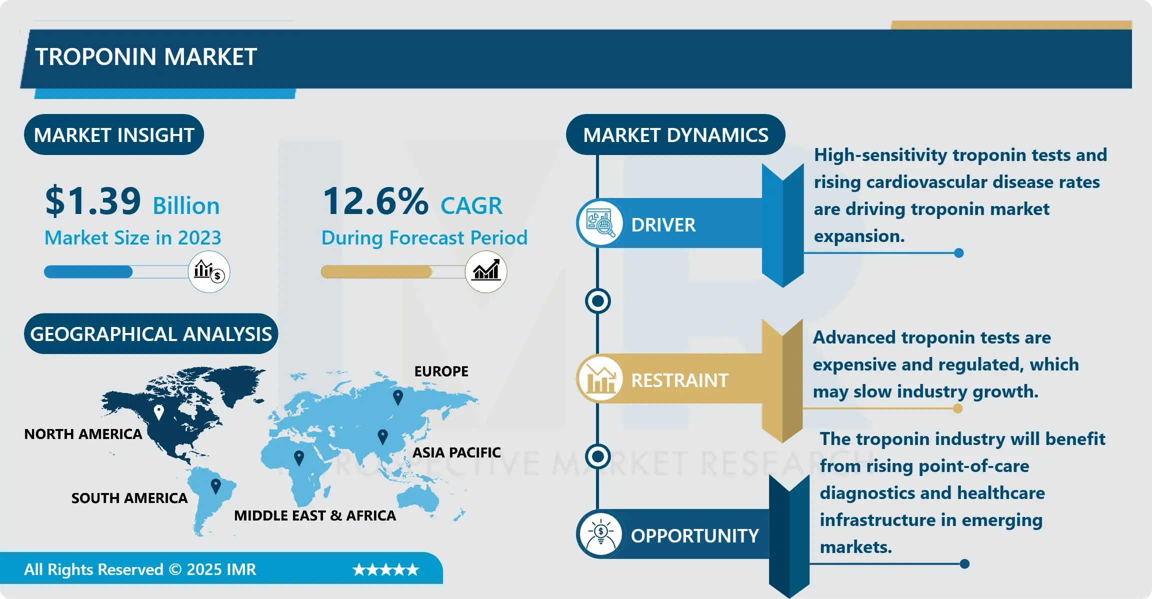 Rising cardiovascular disease prevalence, increasing geriatric populations, and growing awareness of early cardiac risk assessment continue to fuel demand for troponin testing across hospitals, diagnostic laboratories, and specialty clinics globally.