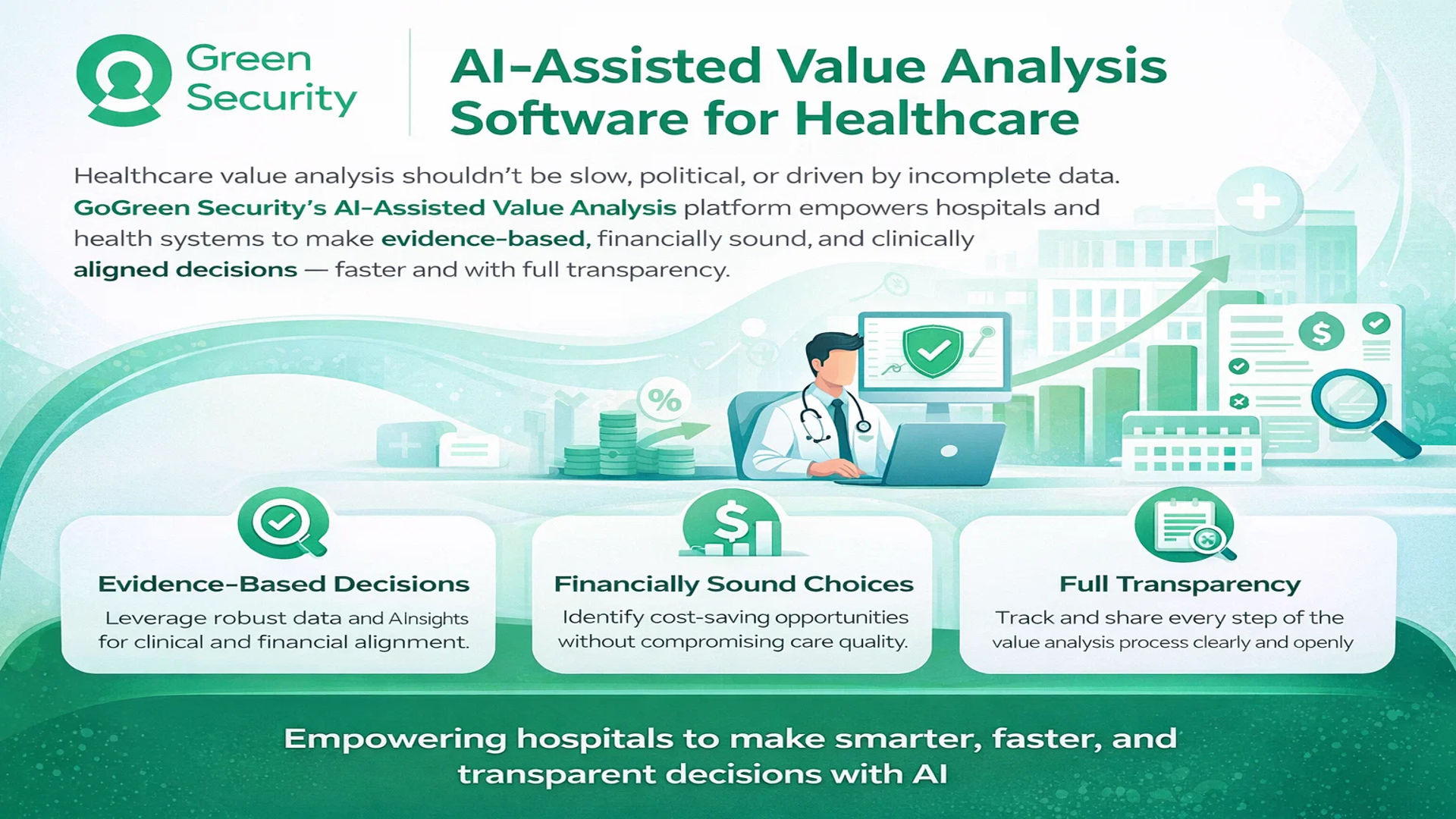 GoGreen Security’s AI-Assisted Value Analysis platform transforms how hospitals and health systems evaluate products, vendors, and purchasing decisions. By combining clinical evidence, financial data, compliance intelligence, and stakeholder input into one intelligent ecosystem, the platform enables faster, evidence-based, and financially responsible decisions with full transparency.