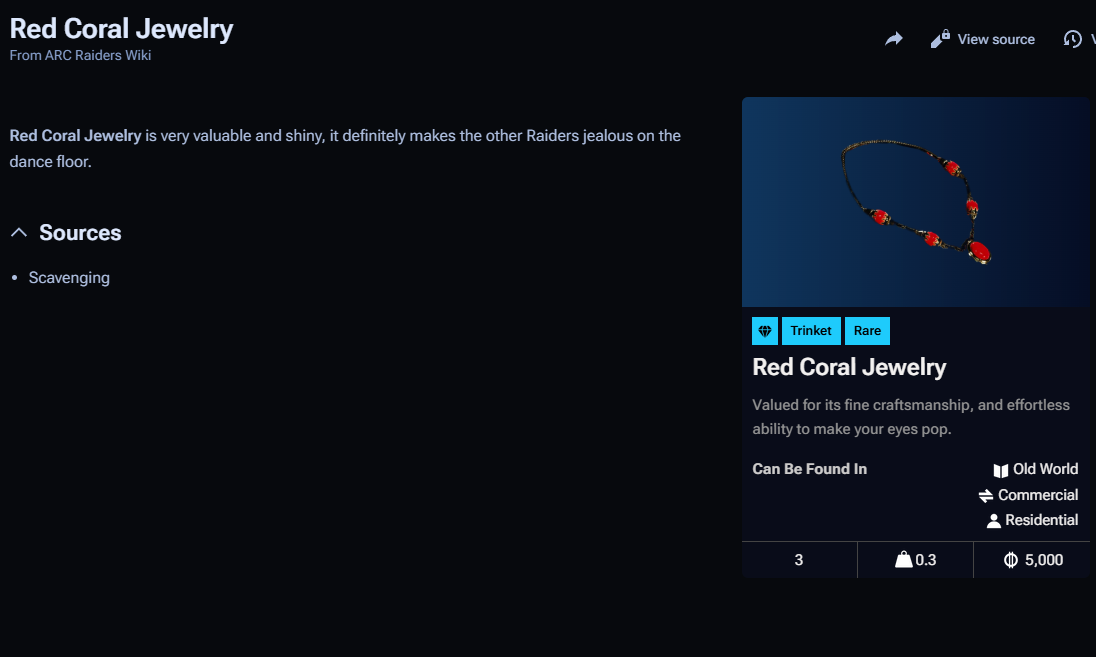 The Red Coral Necklace is a rare, lightweight trinket valued mostly for aesthetics and social status. It can be found in Old World residential and commercial zones through scavenging, and its sell value is stable at 5,000 coins. While it doesn’t impact combat, it has practical uses in trade, collection, and display.