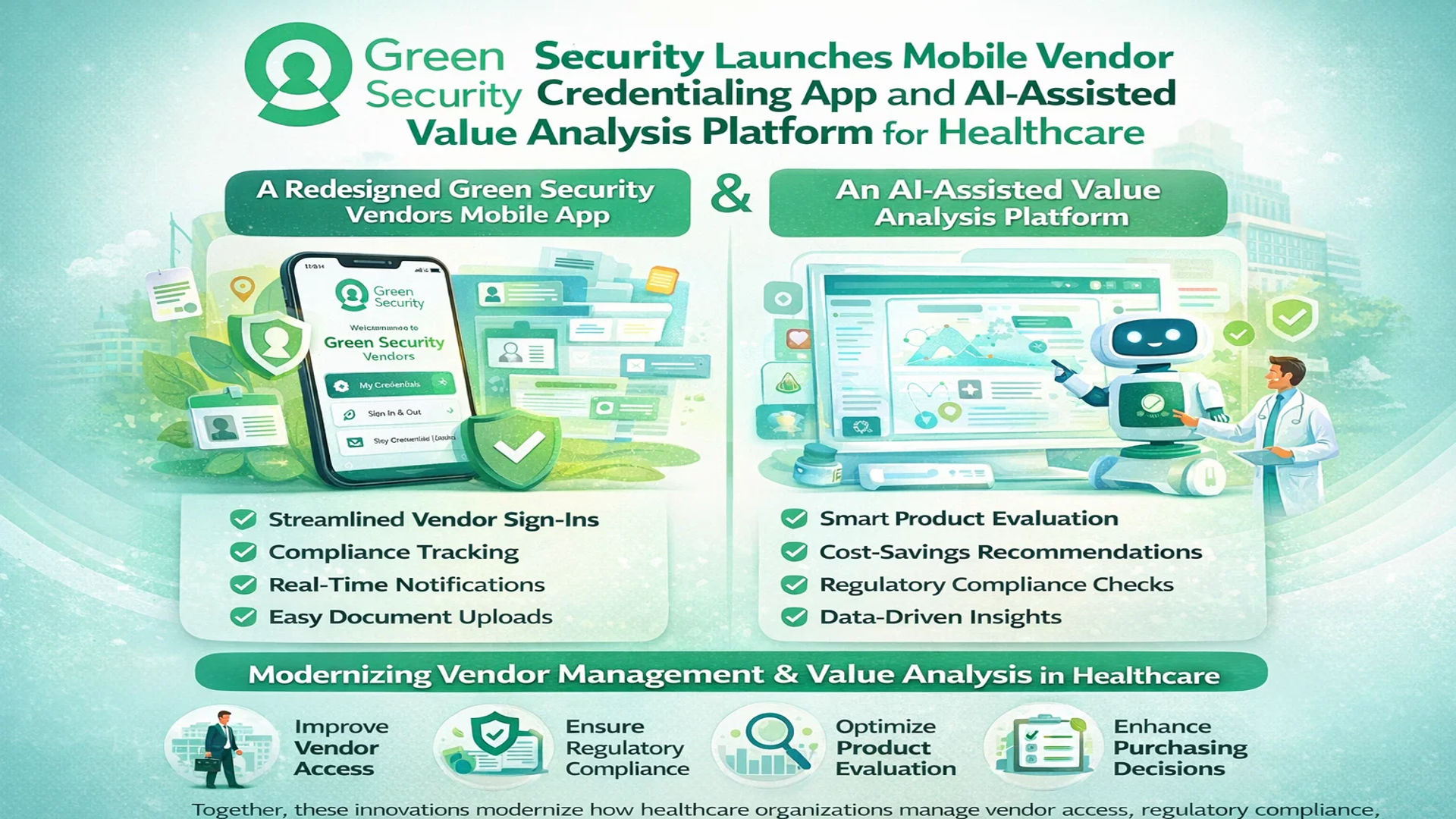 Clearwater, FL — Green Security, a leading provider of healthcare vendor credentialing, facility access compliance, and hospital decision-support technology, today announced the expansion of its digital healthcare ecosystem with two transformative solutions:
