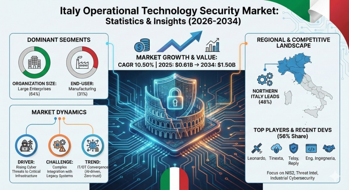 According to the latest report by The Report Cube, study Italy Operational Technology Security Market is anticipated to register a CAGR of 10.50% during 2026–2034, increasing from a market value of USD 0.61 billion in 2025 to USD 1.50 billion by 2034. The Italy Operational Technology Security Market Analysis highlights accelerating adoption of cybersecurity solutions across critical infrastructure, industrial control systems, and manufacturing facilities. As Italy advances its Industry 4.0 agenda, increased integration of digital technologies with operational systems has expanded the attack surface of industrial environments. Cyber threats targeting supervisory control and data acquisition systems, programmable logic controllers, and smart grids are rising, driving sustained Italy Operational Technology Security Growth.