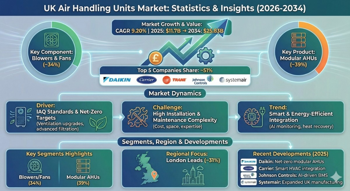 According to the latest report by The Report Cube, study UK Air Handling Units Market is anticipated to register a CAGR of 9.20% during 2026–2034, increasing from a market value of USD 11.7 billion in 2025 to USD 25.83 billion by 2034. The UK Air Handling Units Market Analysis highlights strong growth momentum driven by increasing construction activity, stringent indoor air quality regulations, and rising adoption of energy-efficient HVAC systems. Growing demand for ventilation upgrades in commercial buildings, healthcare facilities, data centers, and educational institutions is accelerating market expansion. The UK’s focus on net-zero carbon targets and green building certifications is encouraging replacement of outdated ventilation systems with advanced, energy-efficient AHUs.