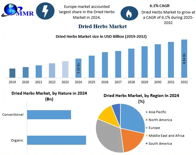 The global Dried Herbs Market is witnessing steady and resilient growth, underpinned by rising demand for processed and convenience foods, increasing awareness of natural and organic ingredients, and the expanding use of herbs across food, pharmaceutical, cosmetic, and personal care industries. Valued at USD 5.50 Billion in 2024, the market is expected to grow at a CAGR of 6.1% from 2025 to 2032, reaching nearly USD 8.84 Billion by 2032.