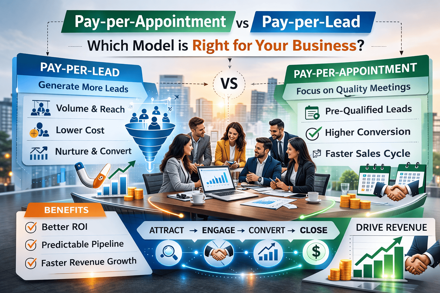 Pay-per-lead supports pipeline building and brand reach. Pay-per-appointment supports pipeline acceleration and direct engagement.