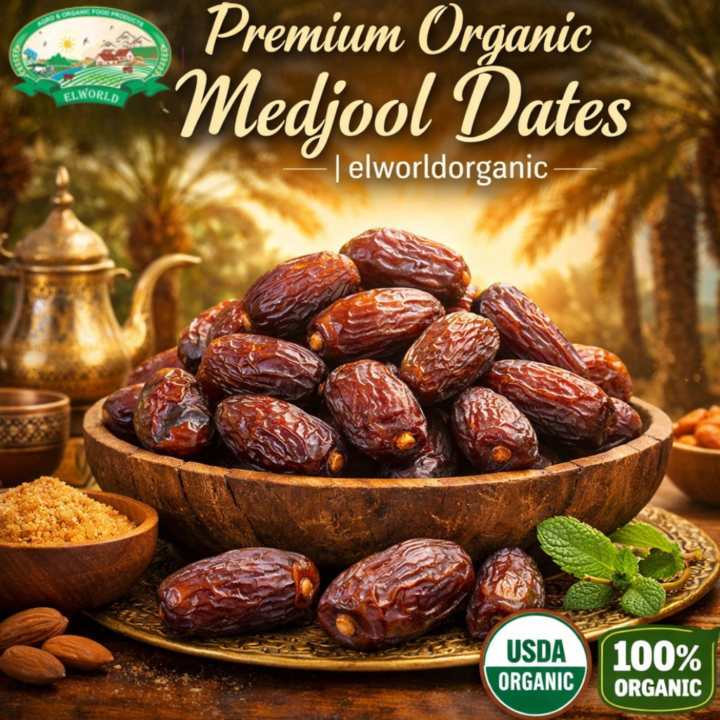 At elworldorganic, we bring you the finest Organic Medjool Dates, cultivated with precision, harvested with care, and delivered with uncompromising quality. Known as the “King of Dates,” Medjool dates stand apart for their exceptional size, caramel-like sweetness, and soft, luscious texture. Our commitment is to provide nature’s purest indulgence—untouched by chemicals, free from artificial preservatives, and packed with wholesome nutrition.