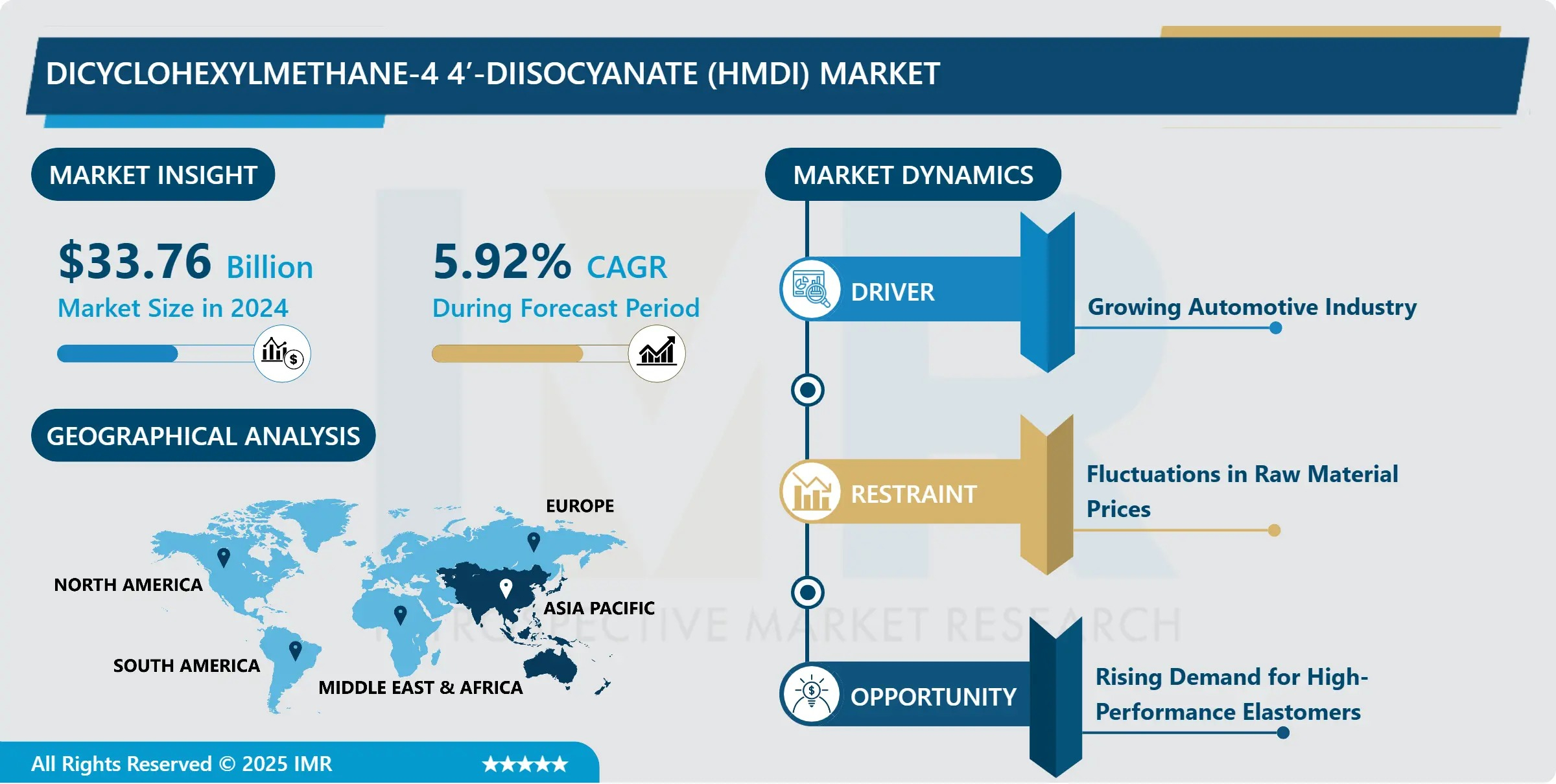“According to a new report published by Introspective Market Research, Dicyclohexylmethane-4,4’-Diisocyanate (HMDI) Market by Product Type, Application, and End-Use Industry, the Global Dicyclohexylmethane-4,4’-Diisocyanate (HMDI) Market Size Was Valued at USD 33.76 Billion in 2024 and is Projected to Reach USD 53.48 Billion by 2032, Growing at a CAGR of 5.92% from 2025 to 2032.”