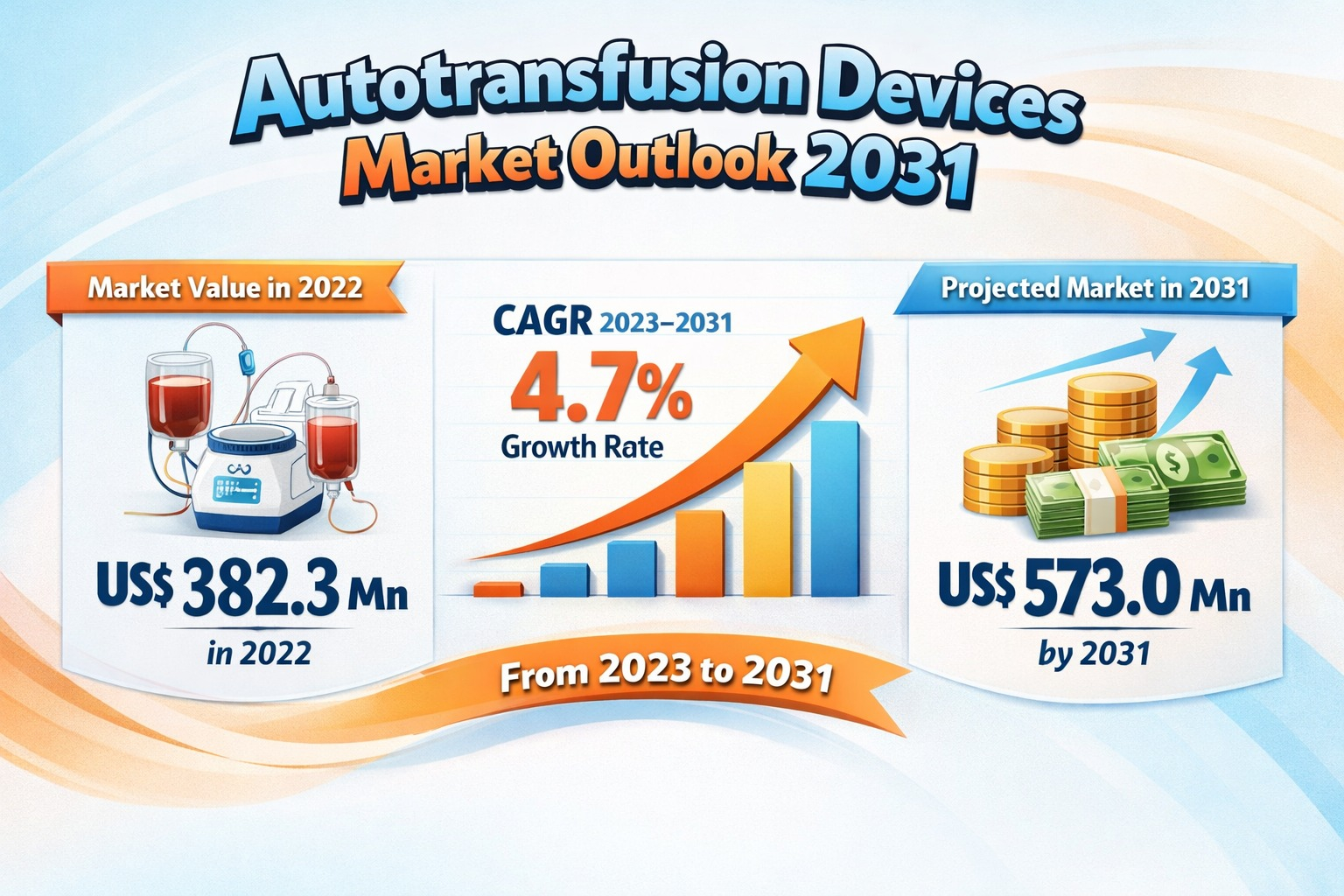 Valued at US$ 382.3 million in 2022, the global Autotransfusion Devices Market is projected to reach US$ 573.0 million by 2031, expanding at a steady compound annual growth rate (CAGR) of 4.7% from 2023 to 2031. The consistent upward trajectory reflects growing clinical acceptance, increased surgical volumes, and continuous technological advancements that are reshaping blood conservation strategies.