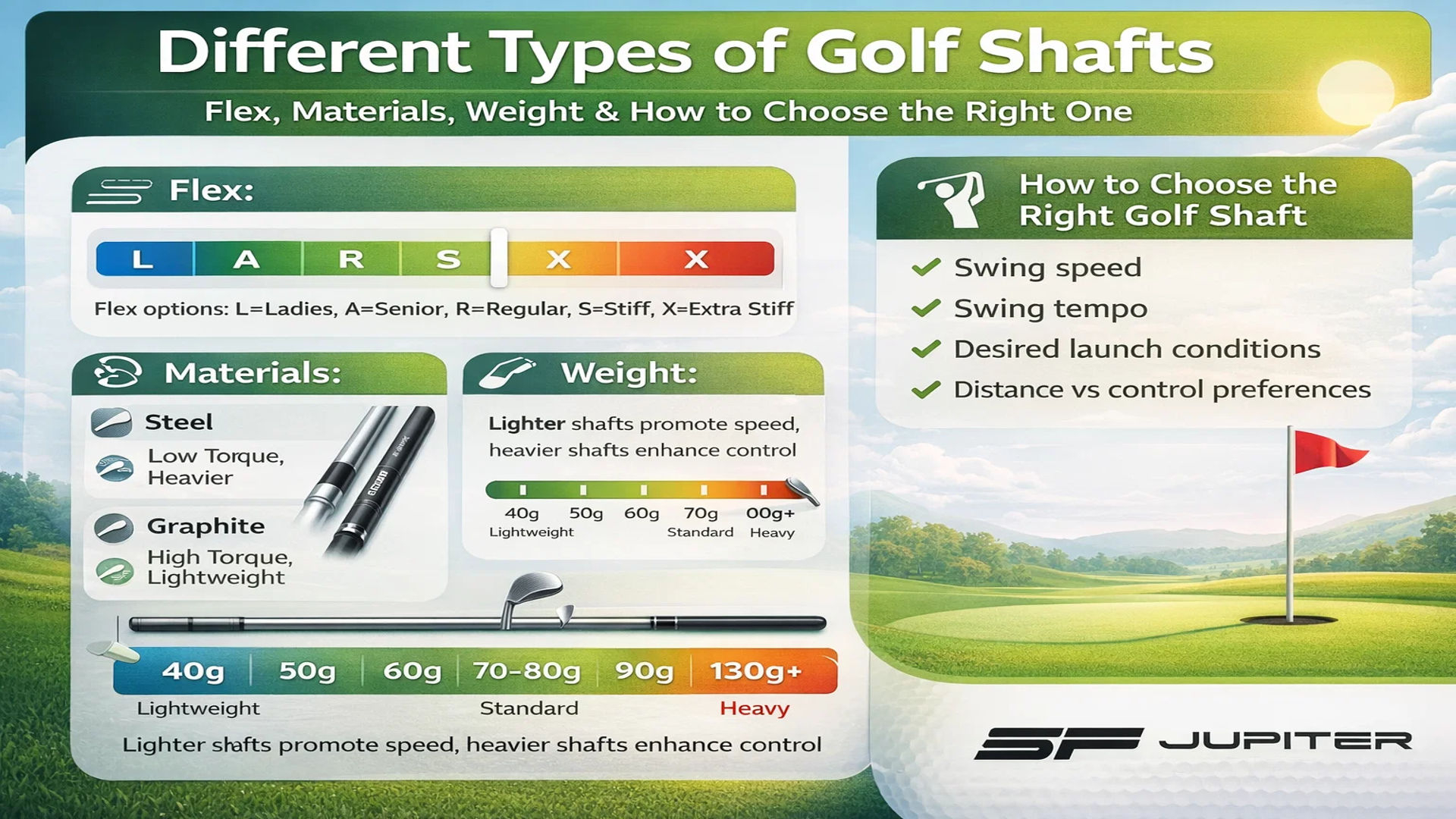 This guide explains the different types of golf shafts, how swing speed affects shaft selection, and how to choose the right shaft for your game.