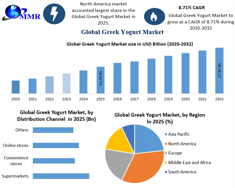 The Global Greek Yogurt Market is witnessing robust growth as consumers increasingly prioritize healthier dietary options and functional food products. According to the latest industry analysis, the market was valued at USD 15.50 Billion in 2025 and is projected to grow at a CAGR of 8.71% from 2025 to 2032, reaching approximately USD 27.82 Billion by 2032. Rising health awareness, increasing demand for protein-rich foods, and the growing popularity of personalized nutrition are among the key factors accelerating market expansion worldwide.