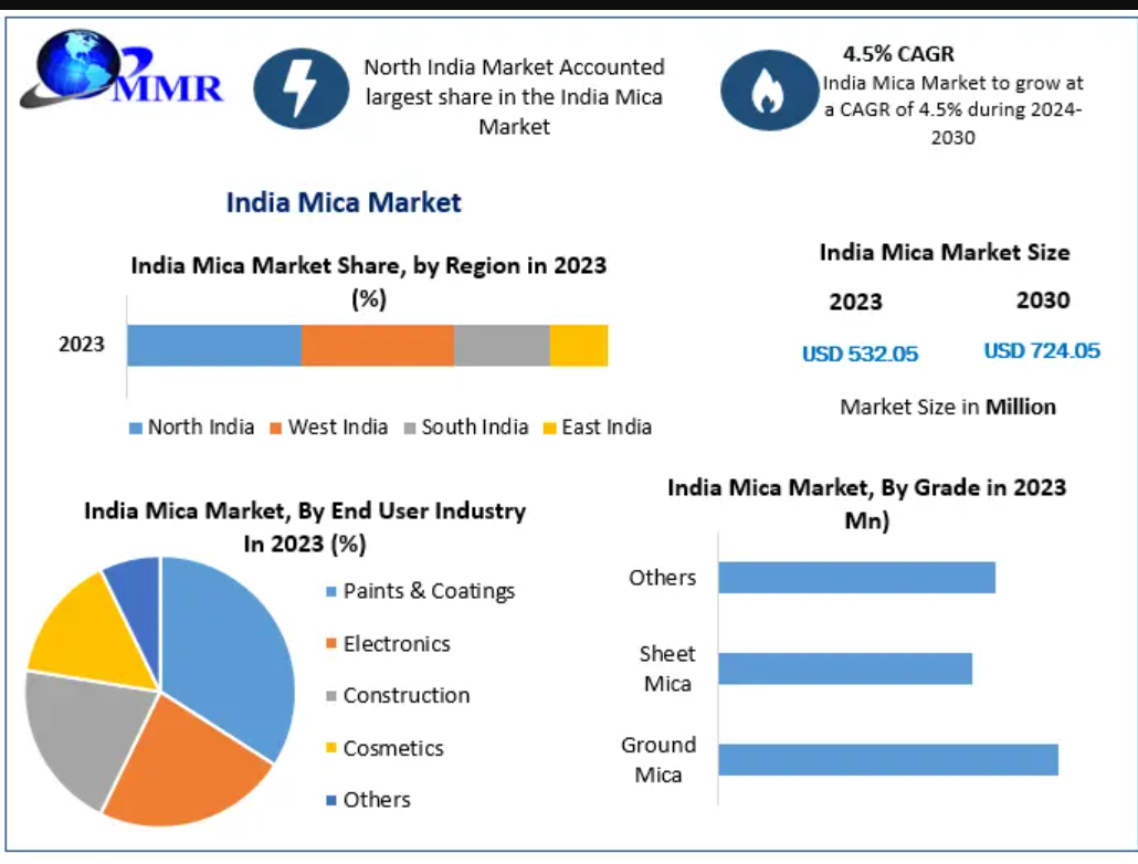 India Mica Market is expected to grow at a CAGR of 4.5% during the forecast period, to reach USD 724.05 Mn. by 2030.