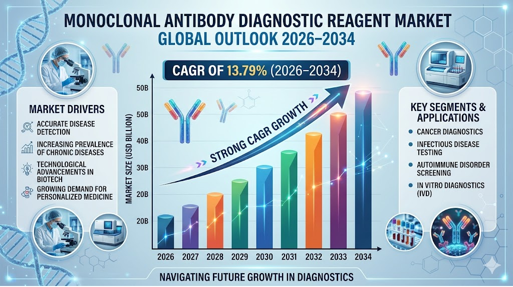 The global monoclonal antibody diagnostic reagent market is poised for significant expansion, driven by the increasing demand for precise and early disease detection solutions. According to The Insight Partners, the market is projected to grow from US$ 12.82 billion in 2025 to US$ 41.02 billion by 2034 , registering a robust CAGR of 13.79% during 2026–2034 .