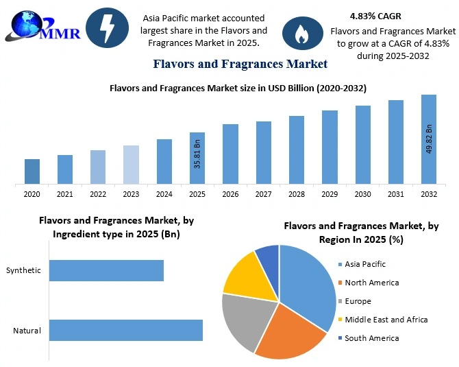 The global Flavors and Fragrances Market is witnessing sustained expansion, driven by evolving consumer preferences, innovation in ingredient development, and the growing influence of lifestyle trends across food, personal care, and household product industries. According to recent market analysis, the industry was valued at USD 35.81 billion in 2025 and is projected to reach nearly USD 49.82 billion by 2032, registering a compound annual growth rate (CAGR) of 4.83% during the forecast period.