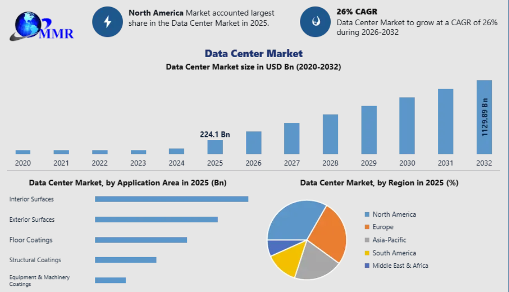 The Data Center Market is experiencing unprecedented growth, with a valuation of USD 224.10 billion in 2025 and a projected surge to USD 1,129.91 billion by 2032, growing at a CAGR of 26% during the forecast period. This rapid expansion is fueled by the increasing demand for cloud services, AI-ready infrastructure, hyperscale computing, and “Everything as a Service” (XaaS) solutions across industries worldwide.
