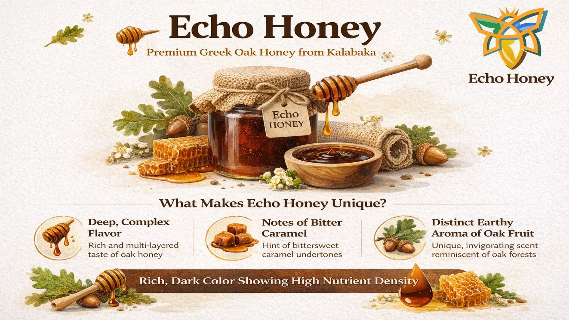 Echo Honey is derived from oak trees growing in a clean, unpolluted mountainous environment. The result is a honey with:
