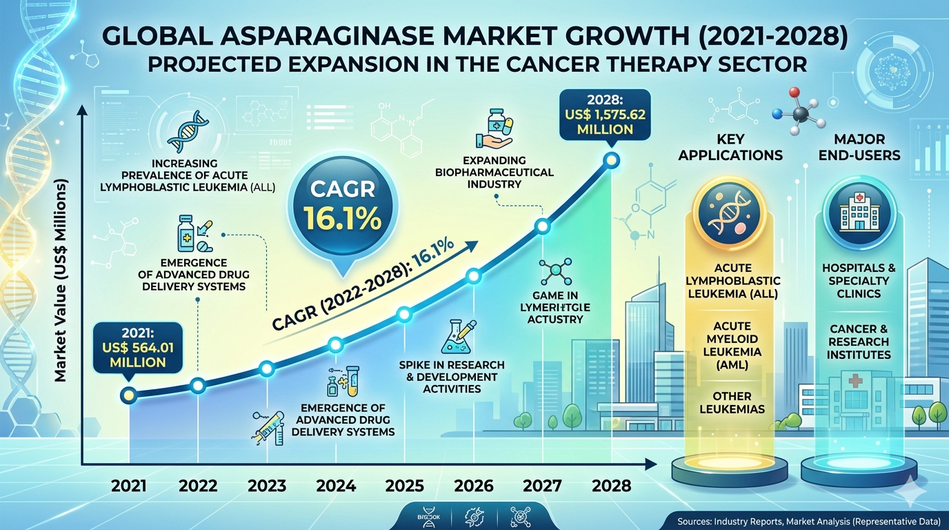 The Asparaginase Market is experiencing steady growth due to the rising incidence of leukemia and growing investments in oncology research. The market is projected to grow from US$ 564.01 million in 2021 to US$ 1,575.62 million by 2028, registering a CAGR of 16.1% during the forecast period. This strong growth trajectory is driven by increasing demand for targeted cancer therapies and the development of advanced drug formulations. The expansion of healthcare infrastructure and improved access to innovative treatments are further supporting the growth of the Asparaginase Market.
