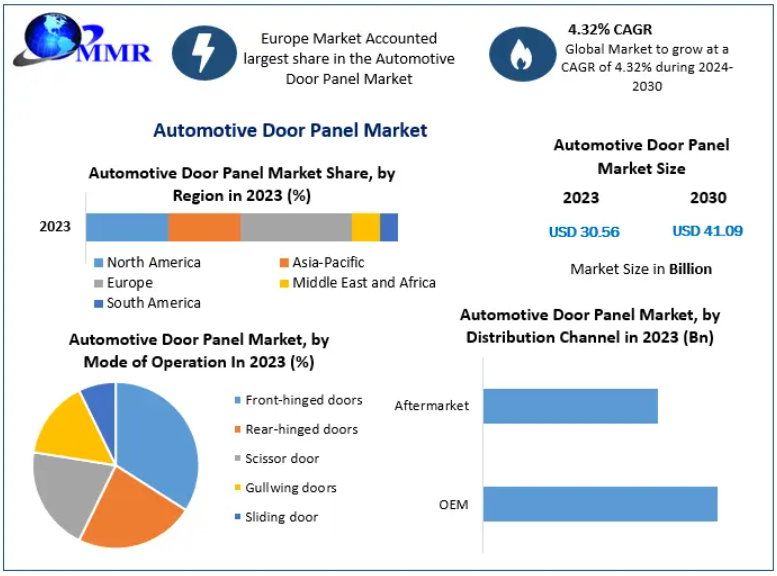The Automotive Door Panel Market is steadily evolving as automakers focus on enhancing vehicle aesthetics, safety, and passenger comfort. The market was valued at USD 30.56 billion in 2023 and is projected to reach USD 41.09 billion by 2030, growing at a CAGR of 4.32% during the forecast period.